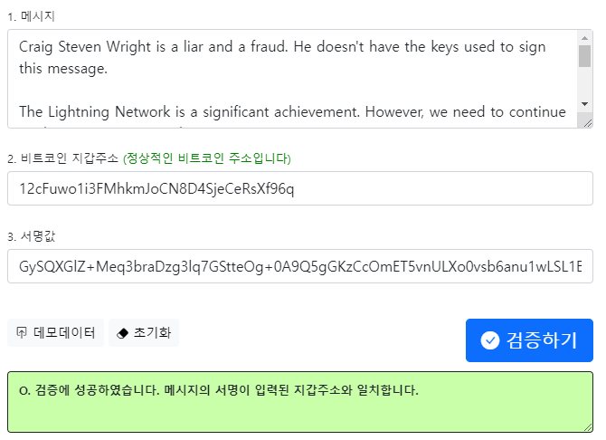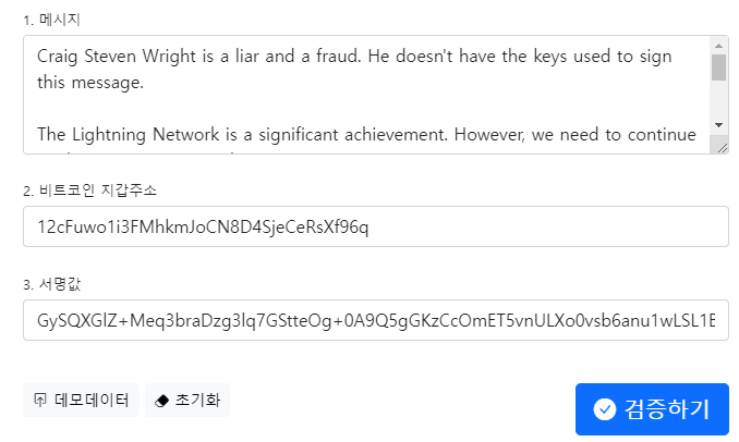 "원문데이터", "비트코인 지갑주소", "서명값" 만 입력하시면